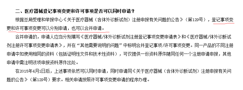 根據總局受理和舉報中心《關于醫(yī)療器械(含體外診斷試劑)注冊申報有關問題的公告》(129號),登記事項變更和許可事項變更可以分別申請,也可以合并申請。
